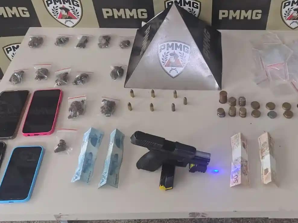 Entre os materiais apreendidos estão uma pistola calibre 9mm, munições, carregador, drogas, balanças de precisão, dinheiro, aparelhos celulares e a motocicleta utilizada na fuga.