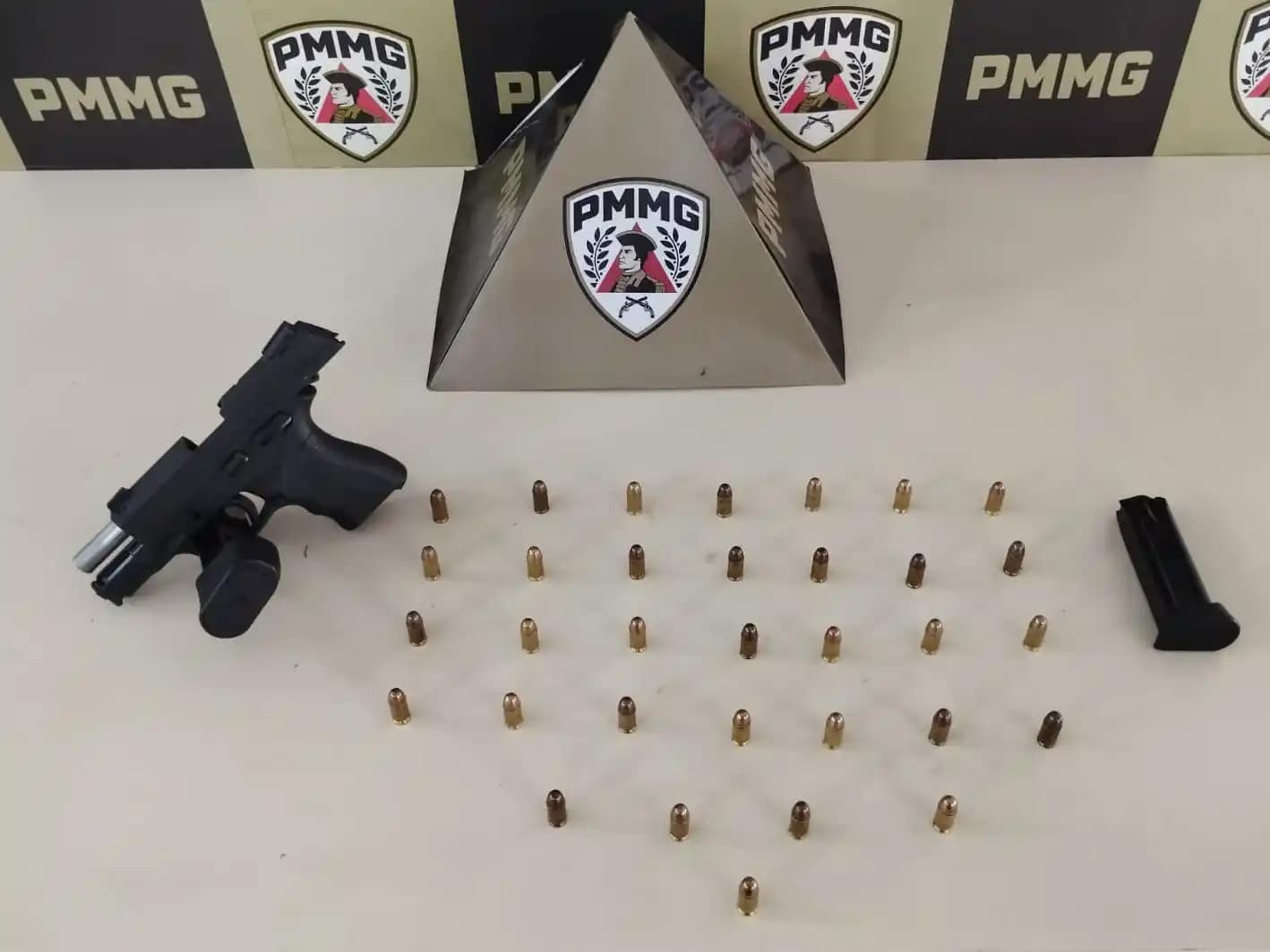 Durante a vistoria no interior do automóvel, os militares encontraram uma pistola calibre .380, dois carregadores e 33 munições do mesmo calibre. Apesar da suspeita inicial, a caminhonete não apresentava irregularidades e acabou sendo liberada.