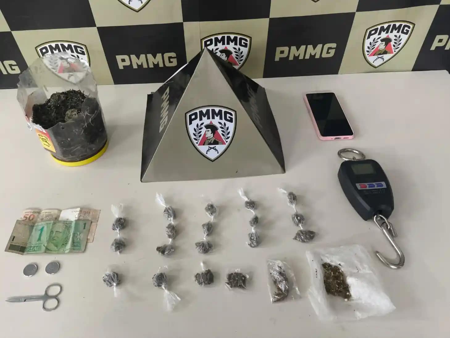 Durante as diligências, os policiais localizaram entorpecentes e materiais comumente utilizados no tráfico de drogas. Ao todo, foram apreendidas 20 buchas de maconha, uma porção da mesma substância, uma balança de precisão, uma tesoura, um aparelho celular e R$ 52 em dinheiro.